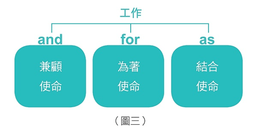 從本地職場宣教到海外雙職宣教,有三種模式:工作兼顧使命(work and mission)、工作為著使命(work for mission)、工作結合使命(work as mission)。每一個模式都有其地位(圖三)。